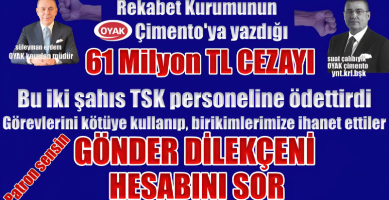OYAK kurumumuzun tüm cenazelerinin 400 bin TSK rütbesi açık olmalıdır. Çalışan herkesin maaşını biz ışıklarız, aç karınlarını biz doyuruyoruz. TSK Rütbeli personeli olmasa sizlerin açlıktan nefesleri kokacağı kesin. TSK'ya ve TSK rütbeli bireylerin birikimlerine ihanet, Vatana katıksız ve mazeretsiz ihanettir. OYAK'ta patron biziz, tüm şirketler ve mallar bize ait.